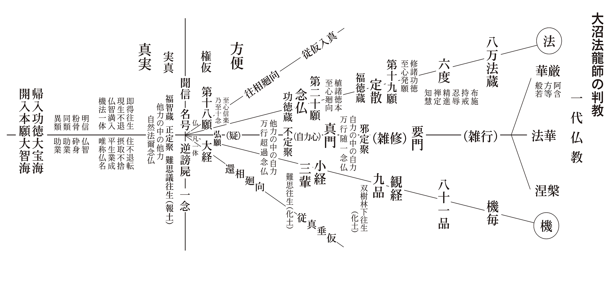 『浄土真宗の三三の法門は、門内において曖昧なものを排除して、純粋無垢の信仰を発揮せんがために、方便より真実に、調機誘引せんとする仏の善巧摂化を顕す大法門』であると明らかにされました。 一 代 仏 教 この図は、大沼法龍和上が釈迦一代の仏教を図示されたものです。 ※題名をクリックしていただくと、別ウインドウにてPDFが開きます。 私の教化の定規 南無阿弥陀仏 光寿二無量 信心歓喜 唯除と若不 破闇満願 罪悪観無常観 信機信法 念々称名常懺悔 信楽開発 真俗二諦 往還二廻向 成就徳器 法龍の使命 唯説弥陀本願海 三願転入 真剣な求道はなくてよいか 『法界』より抜粋 難と易 『随想録』より抜粋 現生十種の益 『光輪』より抜粋